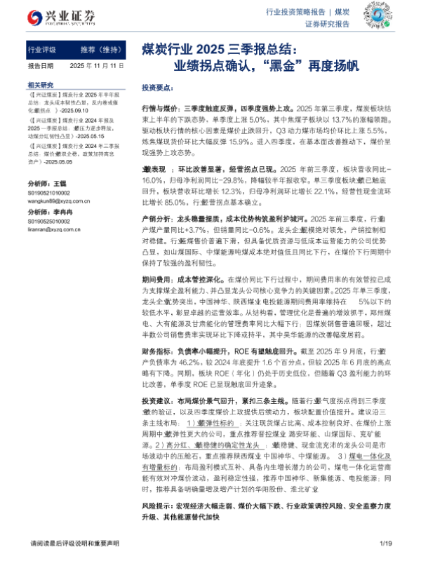 【兴业证券】【202511】煤炭行业2025年半年报总结:龙头成本韧性凸显,反内卷或催化绩拐点-19页 证券期货研究报告