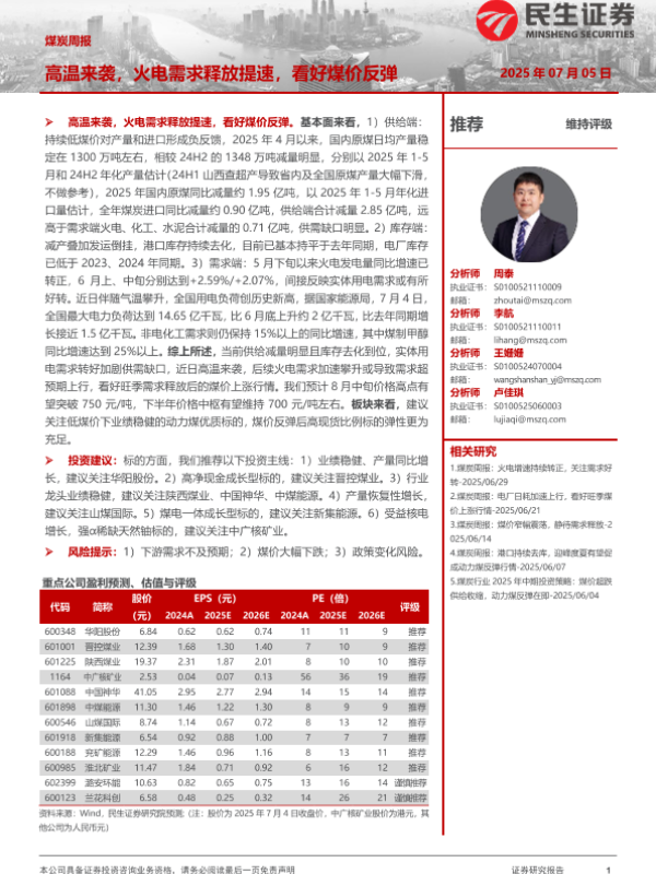 【民生证券】【20250705】煤炭周报:高温来袭,火电需求释放提速,看好煤价反弹-23页 证券期货研究报告