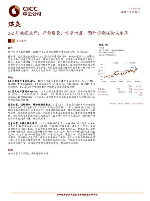 【中金公司】【20210316】煤炭1-2月数据点评:产量增长,需求回落,预计短期煤价或承压-4页 行业研究