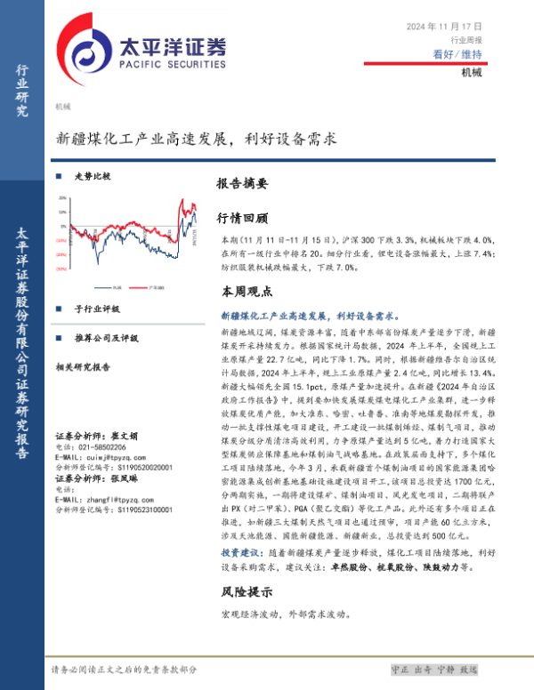 【太平洋证券】【20241117】20241117-太平洋-机械行业周报:新疆煤化工产业高速发展,利好设备需求-19页 行业研究