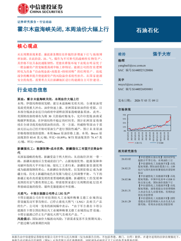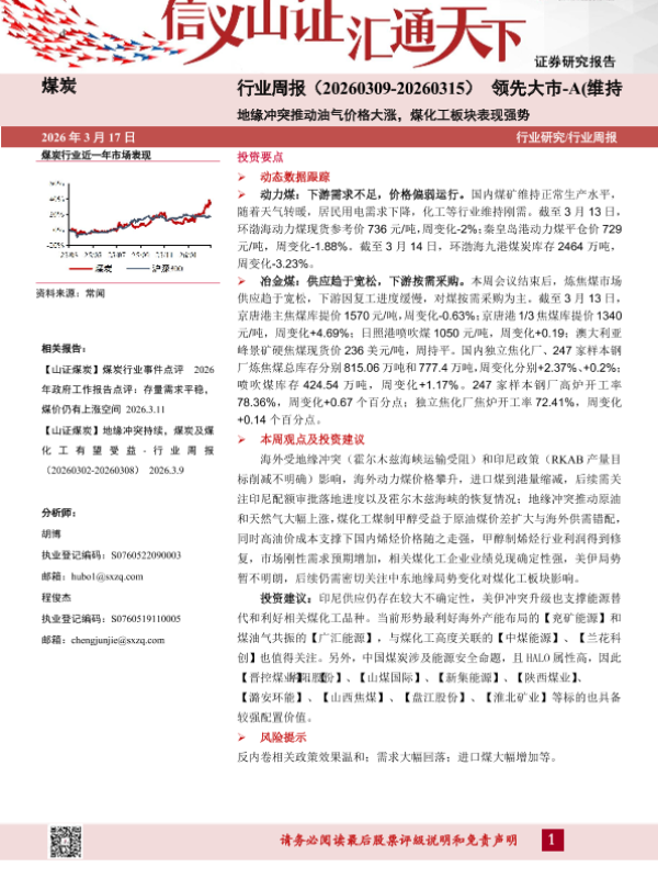 【山西证券】【202603】煤炭行业周报(20260309-20260315)领先大市-A(维持)地缘冲突推动油气价格大涨,煤化工板块表现强势-16页 证券期货研究报告