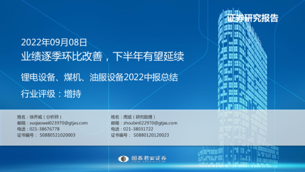 【国泰君安证券】【20220908】锂电设备、煤机、油服设备2022中报总结:业绩逐季环比改善,下半年有望延续-34页 行业研究