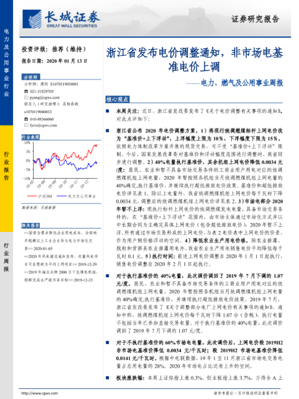 【长城证券】【20200113】电力、燃气及公用事业周报:浙江省发布电价调整通知,非市场电基准电价上调-17页 行业研究