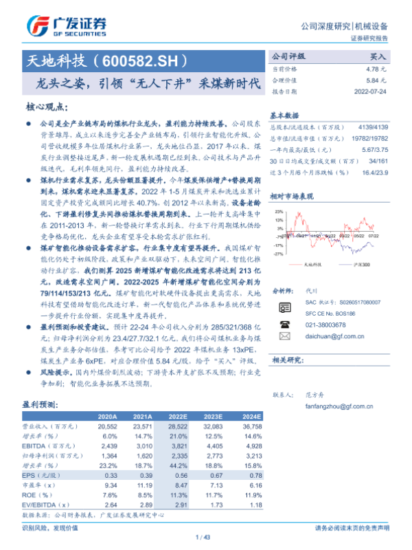 【广发证券】【20220724】天地科技(600582.SH)龙头之姿,引领“无人下井”采煤新时代-43页 行业研究
