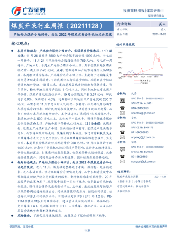 【广发证券】【20211128】20211128-广发证券-煤炭开采行业周报:产地动力煤价小幅回升,关注2022年煤炭交易会和长协定价变化-21页 行业研究