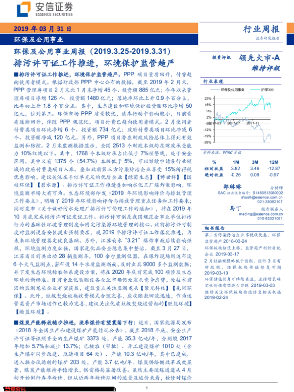 【安信证券】【20190331】环保及公用事业周报:排污许可证工作推进,环境保护监管趋严-16页 行业研究