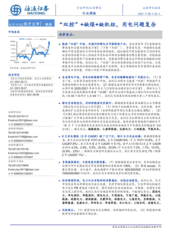 【海通证券】【20210923】公用事业行业周报:“双控”+缺煤+缺机组,用电问题复杂-2页 行业研究