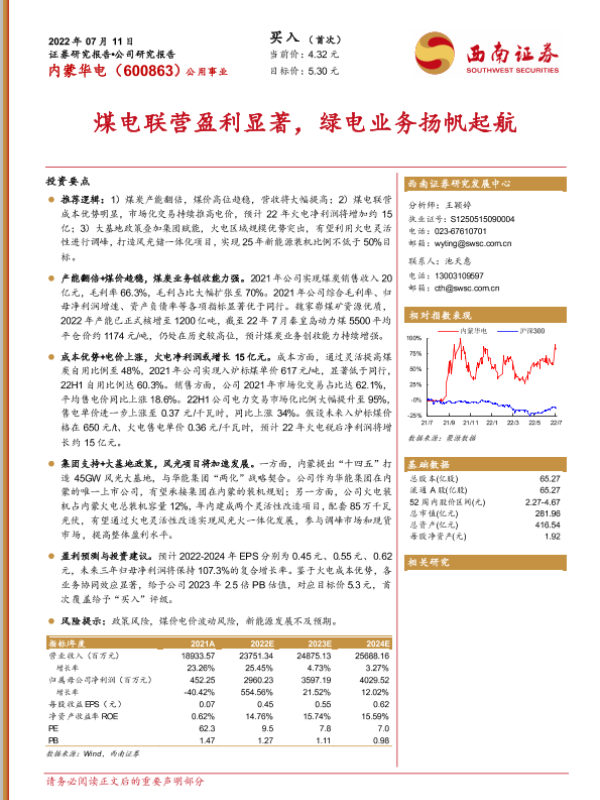 【西南证券】【20220711】20220711-西南证券-内蒙华电-600863.SH-煤电联营盈利显著,绿电业务扬帆起航-30页 行业研究