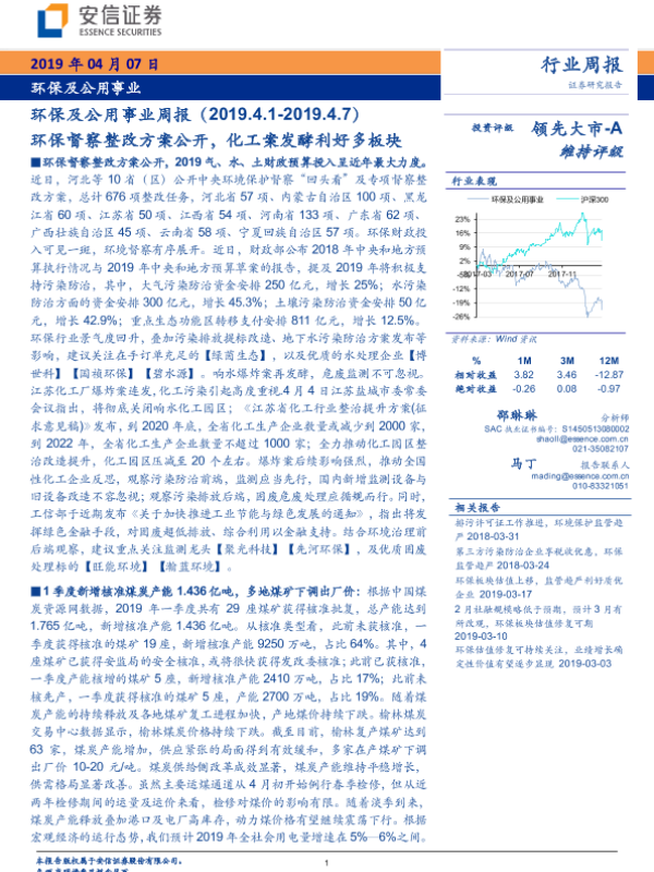 【安信证券】【20190407】环保及公用事业周报:环保督察整改方案公开,化工案发酵利好多板块-16页 行业研究
