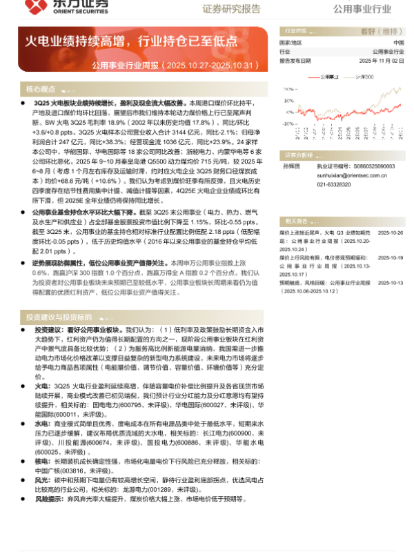 【东方证券】【202510】公用事业行业 周报:火电业绩持续高增,行业持仓已至低点-15页 证券期货研究报告