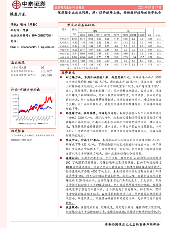 【中泰证券】【20210717】20210717-中泰证券-煤炭开采行业周报:煤炭储备成焦点问题,港口煤价继续上涨,持续看好板块的投资机会-15页 行业研究