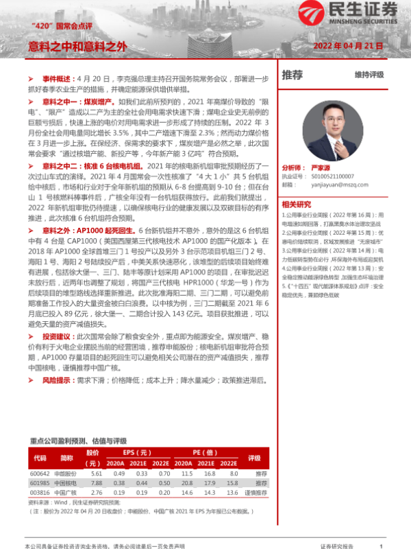 【国海证券】【20220424】公用事业&中小盘行业周报:核电审批加速推进,煤炭增产保供力度大-17页 行业研究