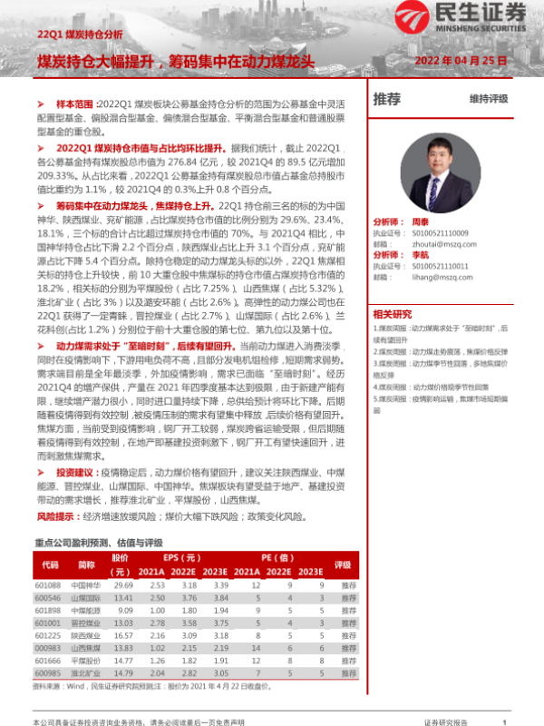 【民生证券】【20220425】22Q1煤炭持仓分析:煤炭持仓大幅提升,筹码集中在动力煤龙头-2页 行业研究