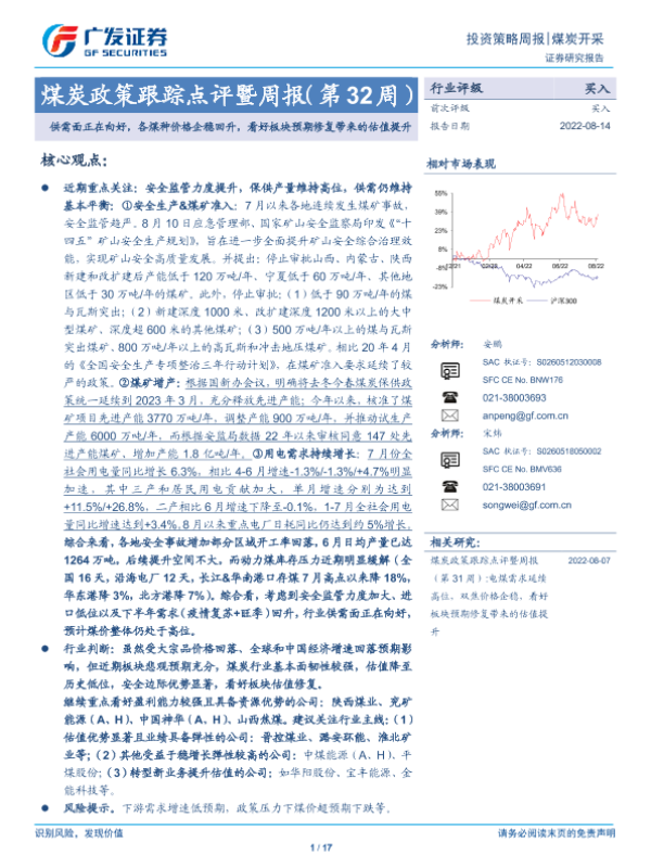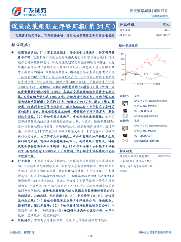 【广发证券】【20220807】20220807-广发证券-煤炭政策跟踪点评暨周报(第31周):电煤需求延续高位,双焦价格企稳,看好板块预期修复带来的估值提升-17页 行业研究