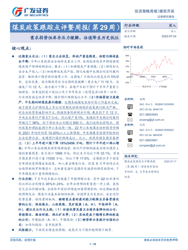 【广发证券】【20220724】20220724-广发证券-煤炭政策跟踪点评暨周报(第29周):需求弱势但库存压力缓解,估值降至历史低位-16页 行业研究