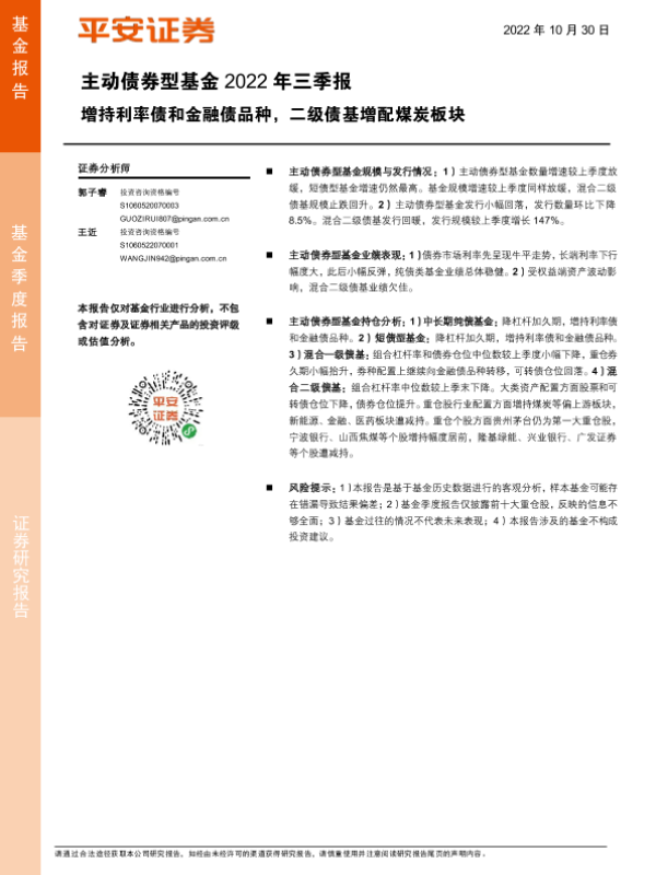 【平安证券】【20221030】主动债券型基金2022年三季报:增持利率债和金融债品种,二级债基增配煤炭板块-19页 行业研究