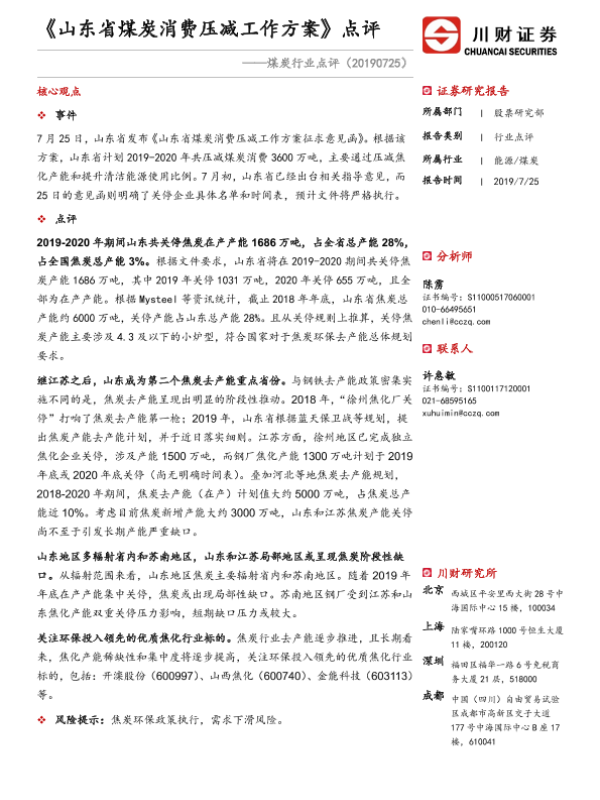 【川财证券】【20190725】20190725-川财证券-煤炭行业点评:《山东省煤炭消费压减工作方案》点评-2页 行业研究
