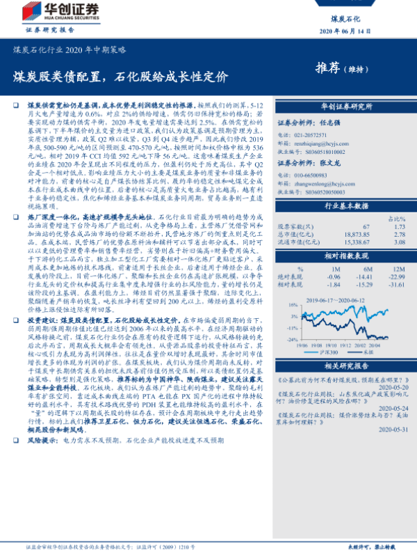 【华创证券】【20200614】煤炭石化行业2020年中期策略:煤炭股类债配置,石化股给成长性定价-23页 行业研究