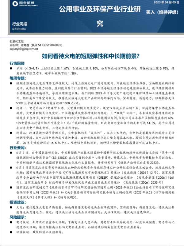 【国金证券】【20230409】公用事业及环保产业行业研究:如何看待火电的短期弹性和中长期前景?-16页 行业研究