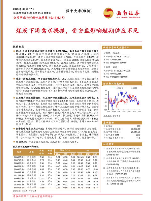 【西南证券】【20230917】公用事业与环保行业周报:煤炭下游需求提振,受安监影响短期供应不足-19页 行业研究