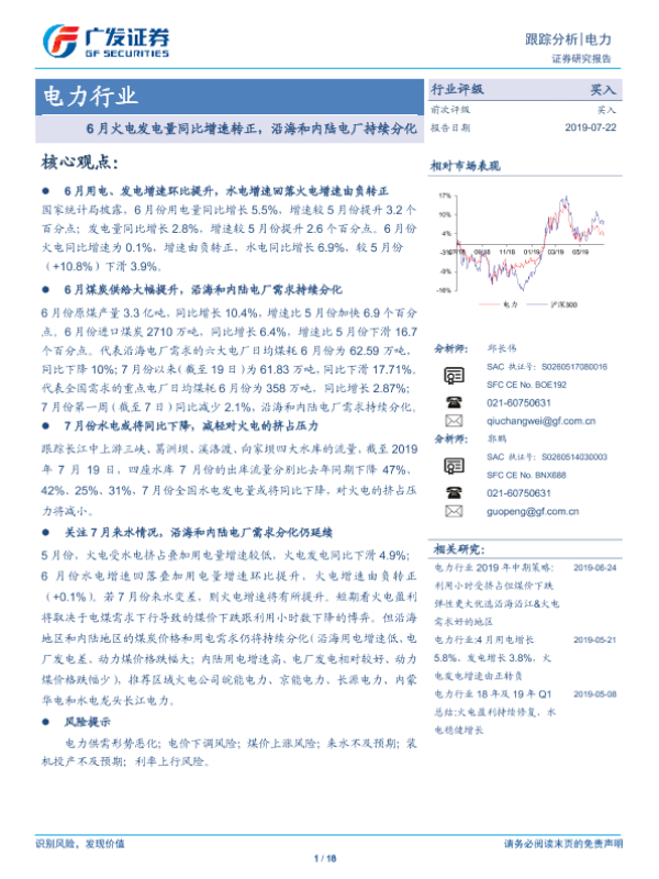 【广发证券】【20190722】6月火电发电量同比增速转正,沿海和内陆电厂持续分化-18页 行业研究