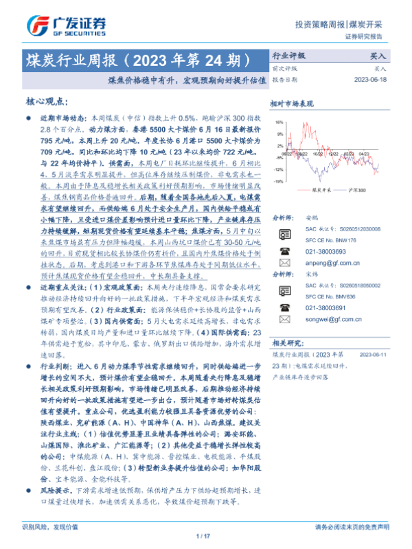 【广发证券】【20230618】20230618-广发证券-煤炭行业周报(2023年第24期):煤焦价格稳中有升,宏观预期向好提升估值-17页 行业研究