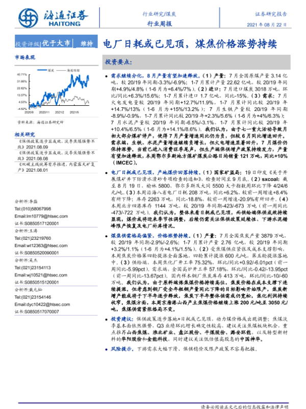 【海通证券】【20210822】20210822-海通证券-煤炭行业周报:电厂日耗或已见顶,煤焦价格涨势持续-2页 行业研究