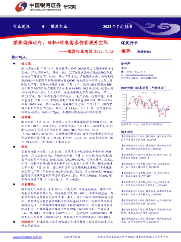 【银河证券】【20230715】20230715-中国银河-煤炭行业周报:煤焦偏强运行,日耗+非电需求仍有提升空间-22页 行业研究