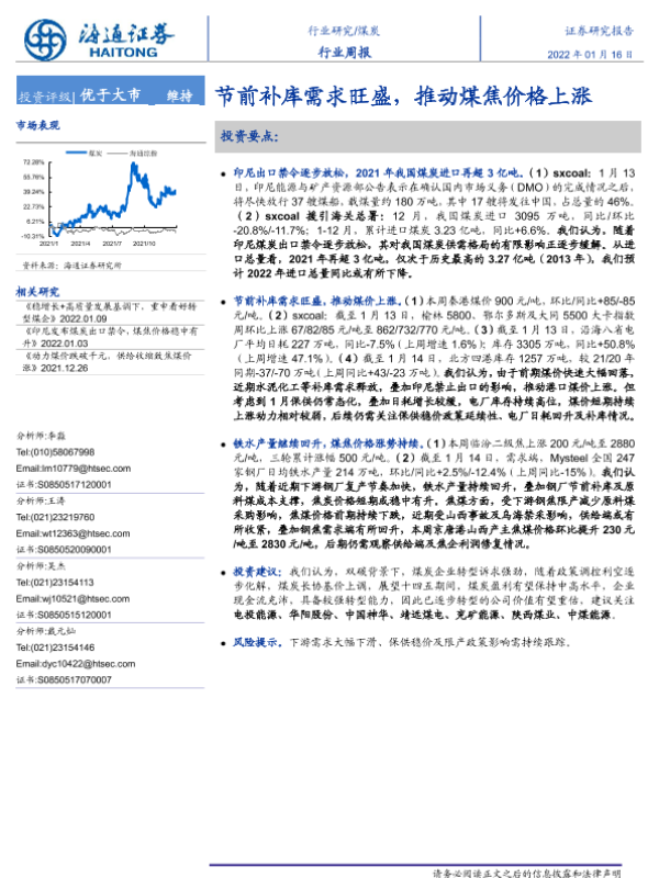 【海通证券】【20220116】煤炭行业周报:节前补库需求旺盛,推动煤焦价格上涨-2页 行业研究