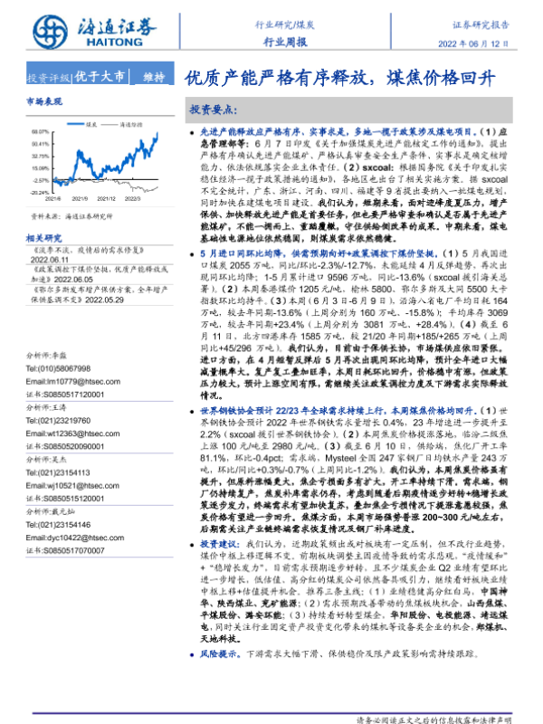 【海通证券】【20220612】20220612-海通证券-煤炭行业周报:优质产能严格有序释放,煤焦价格回升-2页 行业研究