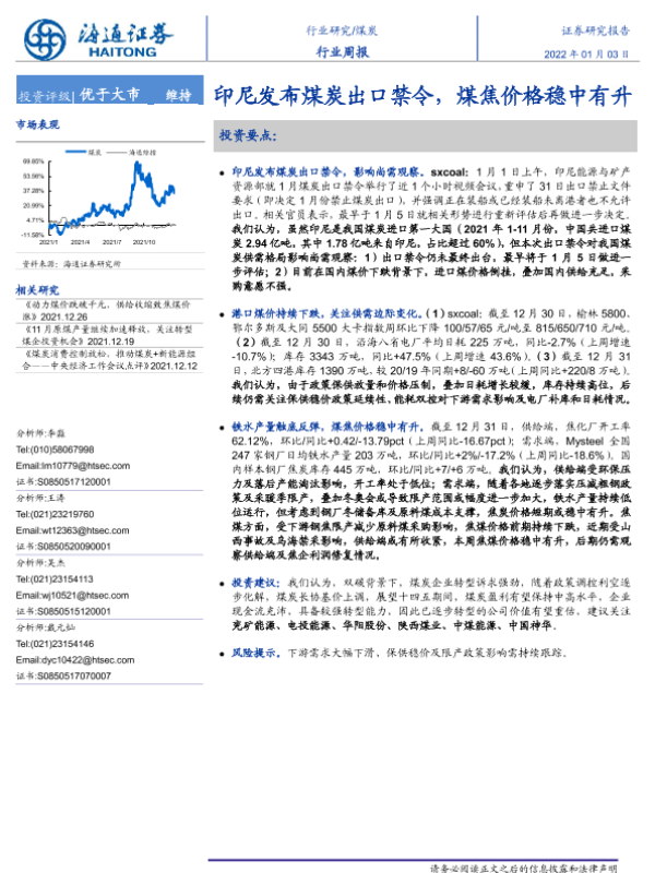 【海通证券】【20220103】20220103-海通证券-煤炭行业周报:印尼发布煤炭出口禁令,煤焦价格稳中有升-2页 行业研究
