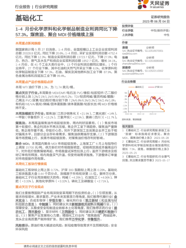【天风证券】【20230604】20230604-天风证券-基础化工行业研究周报:1-4月份化学原料和化学制品制造业利润同比下降57.3%,煤焦油、聚合MDI价格继续上涨-19页 行业研究