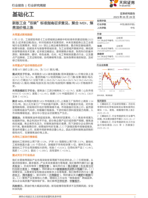 【天风证券】【20230528】20230528-天风证券-基础化工行业研究周报:新版工业“双碳”标准指南征求意见,聚合MDI、煤焦油价格上涨-19页 行业研究
