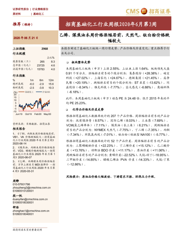 【海通证券】【20200621】招商基础化工行业周报2020年6月第3周:乙烯、煤焦油本周价格涨幅居前,天然气、钛白粉价格跌幅较大-21页 行业研究