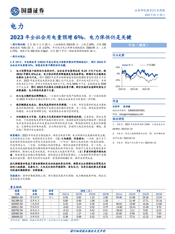 【国盛证券】【20230129】电力行业周报:2023年全社会用电量预增6%,电力保供仍是关键-17页 行业研究
