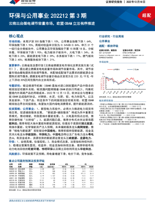 【国信证券】【20221218】环保与公用事业202212第3期:云南出台煤电调节容量市场,欧盟CBAM立法有序推进-30页 行业研究