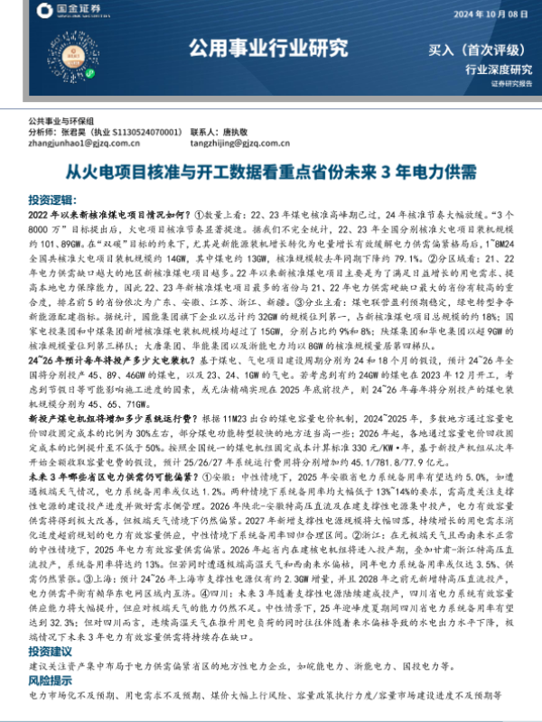 【国金证券】【20241008】公用事业行业研究:从火电项目核准与开工数据看重点省份未来3年电力供需-24页 行业研究