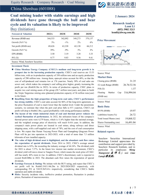 【东吴证券(香港)】【20240102】稳定盈利穿越牛熊周期,高股息煤炭巨头迎价值重估-7页 行业研究