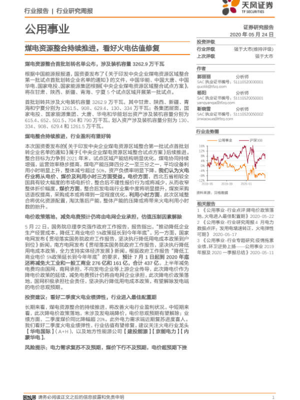 【天风证券】【20200524】公用事业行业研究周报:煤电资源整合持续推进,看好火电估值修复-15页 行业研究
