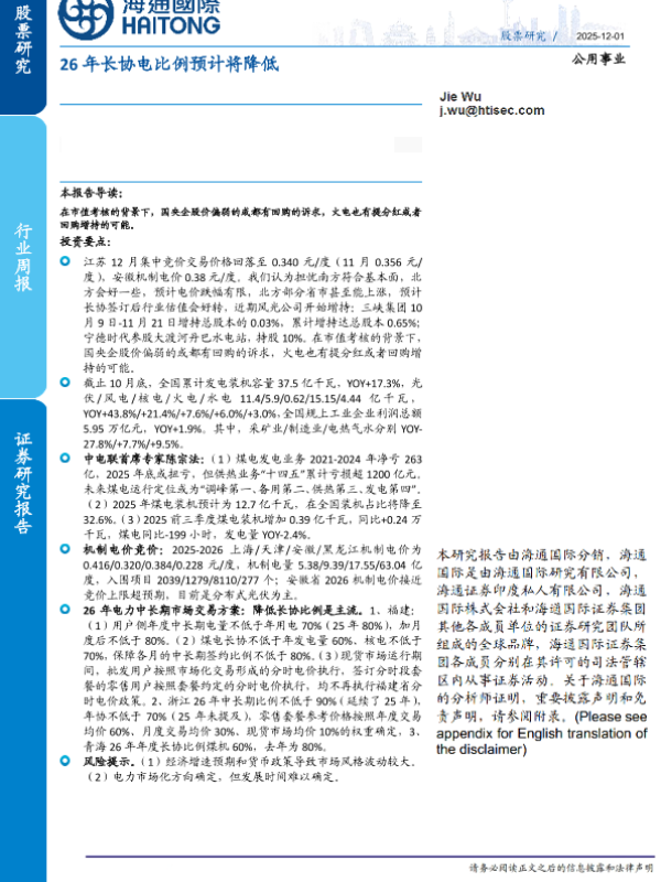 【海通国际】【202512】公用事业行业周报:26年长协电比例预计将降低-9页 证券期货研究报告