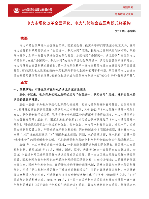 【大公国际】【2025】电力市场化改革全面深化,电力与储能企业盈利模式将重构-6页 行业研究
