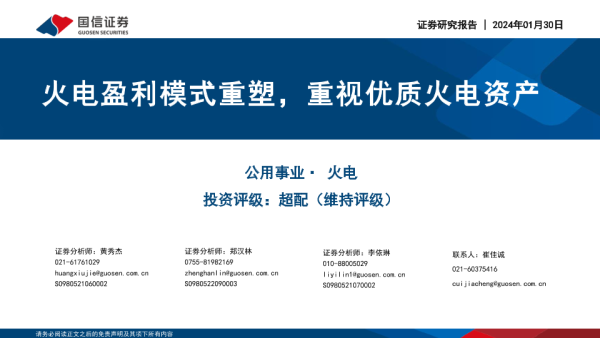 【国信证券】【20240130】公用事业:火电盈利模式重塑,重视优质火电资产-32页 行业研究