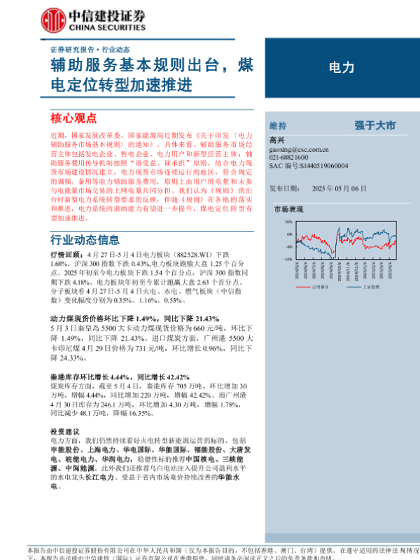 【中信建投证券】【20250506】电力行业动态:辅助服务基本规则出台,煤电定位转型加速推进-15页 证券期货研究报告