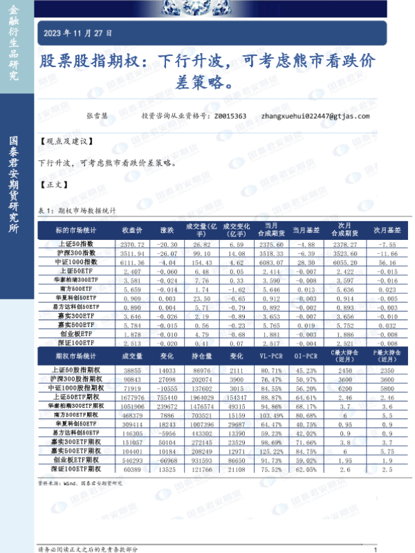 【国泰君安期货】【20231127】股票股指期权:下行升波,可考虑熊市看跌价差策略。-16页 行业研究