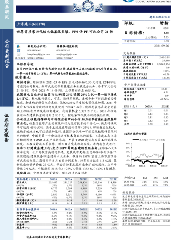【国泰君安证券】【20210926】20210926-国泰君安-上海建工-600170.SH-世界首座第四代核电钍基熔盐堆,PE9倍PE可比公司21倍-22页 行业研究