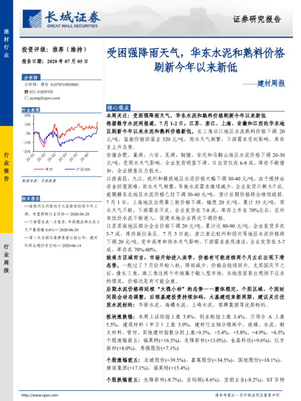 【长城证券】【20200705】受困强降雨天气,华东水泥和熟料价格刷新今年以来新低-18页 行业研究