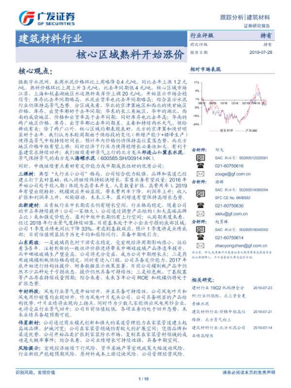 【广发证券】【20190728】建筑材料行业跟踪分析:核心区域熟料开始涨价-10页 行业研究
