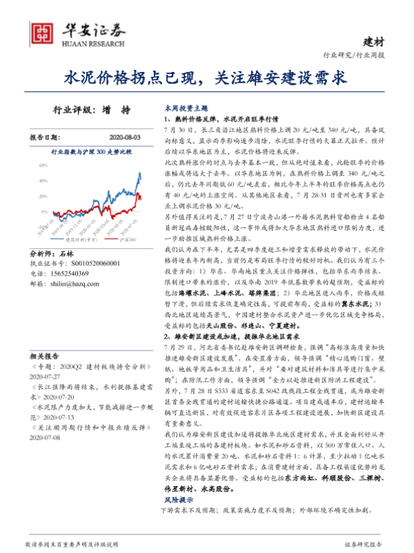【华安证券】【20200803】建材行业周报:水泥价格拐点已现,关注雄安建设需求-14页 行业研究