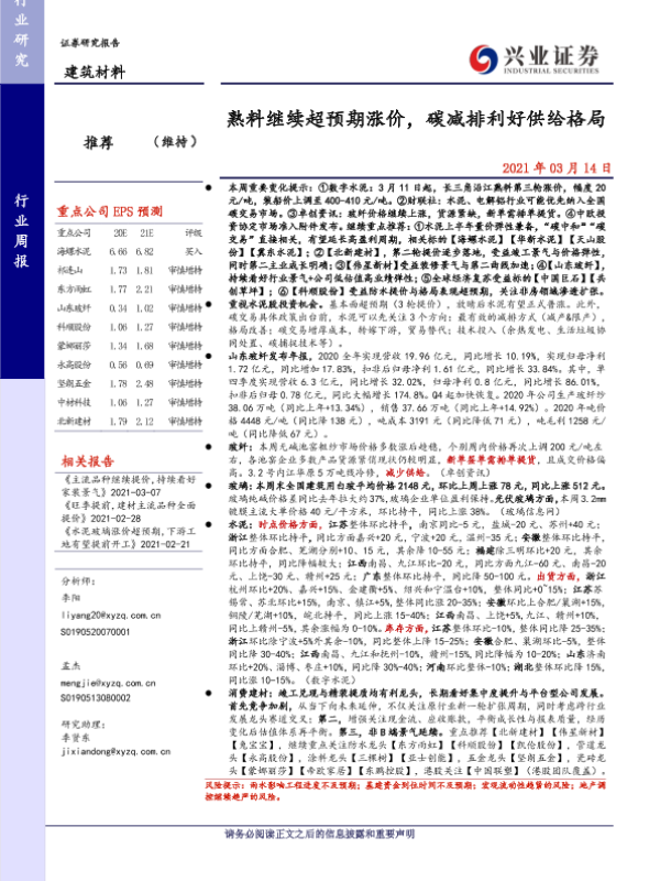 【兴业证券】【20210314】建筑材料行业周报:熟料继续超预期涨价,碳减排利好供给格局-20页 行业研究