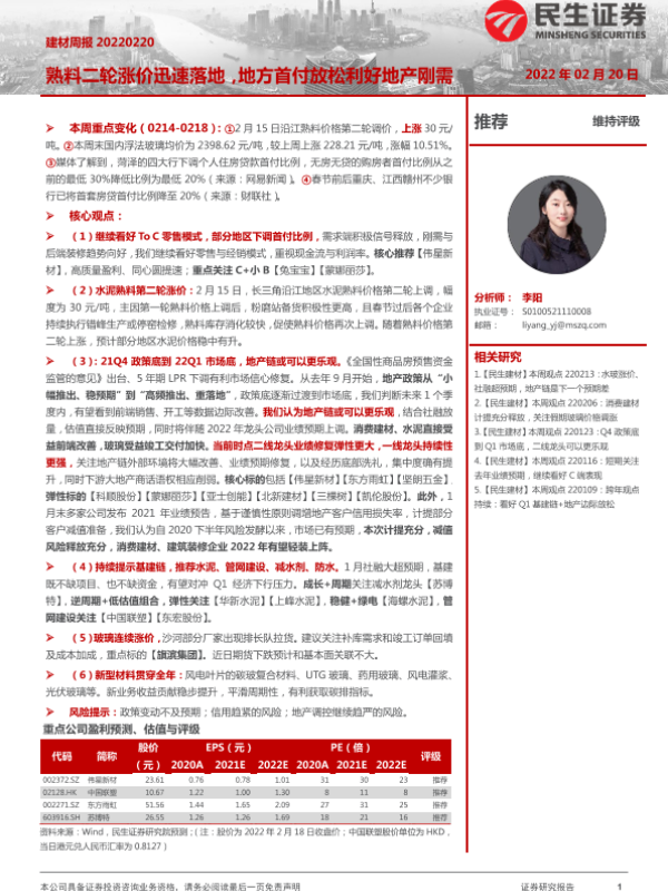 【民生证券】【20220220】建材周报:熟料二轮涨价迅速落地,地方首付放松利好地产刚需-19页 行业研究